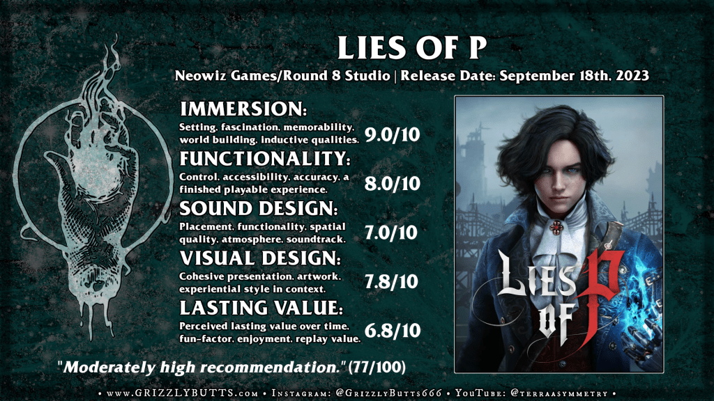 Every year since 2011 or so smaller developers have taken to attempting to re-create or plainly copy the Dark Souls experience: Difficult yet weighted third person combat, metroidvania-esque exploration, hands-off narration and plenty of rich ambient storytelling within a distinct dark fantasy world. I get the appeal and I am certainly part of that demographic who will try anything in this action RPG (or quasi-RPG) style though it has never been a guarantee in terms of quality even when under the hallowed From Software umbrella. I’ve been burned by some real student project level trash (Immortal Unchained, Mortal Shell, Hellpoint, Thymesia to name just a few…) in this vein over the years and a few games which were obviously doing their best to design something functional in that space such as Code Vein (2019) or last year’s Steelrising (2022) and the most common faults are predictable. The biggest failures in this space come from lackluster/generic world-building, ineffective or unbalanced combat mechanics, and worst of all lack of distinct level/area design which justifies the mechanics of the game. This’ll be a much bigger point of conversation surrounding the horrendous Lords of the Fallen (2023) but eh, we’ll get there when we get there. The Lies of P experience stands out quite naturally in this space not only for its uniquely stylized world but the level of polish the game has received in terms of its physics generally making sense, the combat in particular has a nice amount of weight to its hits on both ends, and the whole of its design reading as cohesive throughout the the experience.