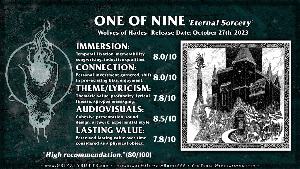 At face value Order of Nine gives the impression that they’ve considered every aspect of their presentation, a representative logo, Tolkien-tinged lore as the backdrop, a majestic black castle as the centre of a brilliant cover artwork and the carefully crafted music within reinforces that impression. The first thing that comes to mind is of course USBM’s endless romance with the melodic side of Scandinavian black metal, in this case the keyboards are hardly as important as a melodic device and the brooding riff-driven pieces within are generally mid-paced and romanticist in their swaying, mid-period Satyricon-like motions. Tales of medieval desolation, sorcery and misery all make for classicist dressings and the modern yet proficient performances suggest folks who’ve honed their craft for some time but this all comes carefully, note-for-note as if tragic poem and less as brazen warrior snarl at least in the sense that I don’t yet hear a personality beyond perfectionism and a brilliant ear for the balance of the mix/master which tempers things toward the atmospheric black metal listeners ear with largely obscured vocal enunciation and a looming keyboard fog. “Mother of Shadows” is probably the piece to pull the ear into the fray if you’re an earlier Emperor hound but the rest of the album is frankly more interesting for how much it deviates from the escalating guitar runs and keys, etc. Anyhow, for a debut this is a very impressive and finely curated feat which only just lacks some extra personality/personae to take it above and beyond being somewhat normative. What kicks the score up towards a higher recommendation is the sense that this is potentially pure pleasure listening for a certain type of fandom, myself included.