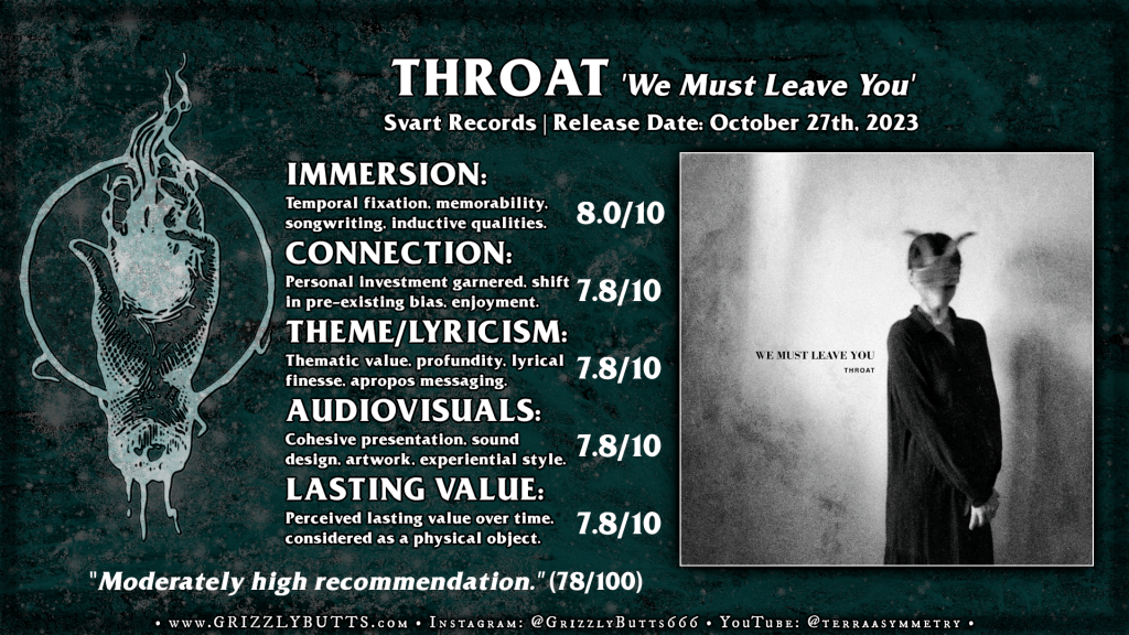 After steadily infusing various kinks within the ever-extending hose of their sound Turku, Finland-based anti-rock quartet Throat have consciously begin to insert smog and self-preservation into their oeuvre, be it clangorous ex-sludged noise rock, post-industrial nightmares, or the release of their inky gothic wings here on album number four. No doubt I was horny for the last two records they’d put out and first for the introduction and promise of ‘Bareback‘ (2018) and the subversive conveyor belt for human depravity that was ‘Smile Less‘ (2021) though we find a third-degree entrant here a couple years later with ‘We Must Leave You‘, proposed as a “break-up” record of sorts. The catch is that this frowning, existential dread-bulging bout of angst seeks to end their LTR with Earth, the lot of it. We’d heard louder hints of this style and sentiment on the last record but there was anger, passion, and machine like daggering beats to dance along to. In this case you’re instructed to hang your head and recognize that it ain’t working. Its not you, its us.