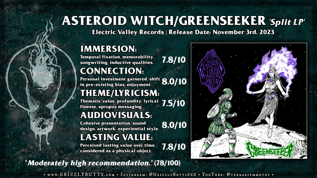 Although I know next to nothing about Portland, Oregon-borne psychedelic/space’d rock crew Asteroid Witch I definitely fell face first into their jam up front, probably one of the most welcoming portals of unreal fuzz and float I’ve dropped into lately. “Time Crystal/Mind Prism” is probably the most practical point of gush here but stick around for the last two pieces on their side if you’re up for something more adventurous, buzzing and space rock influenced. Over on Side B we’ve got another PDX group, the more familiar faces in Greenseeker who’ve a similarly jammed, key’d up, and easygoing stoner/psych stretch to their vision. Their two extended pieces here are a bit of a shift beyond ‘The Wish‘ (2022) where they’ve eased back in their chairs, sunken into these songs and taken their time with each tale. Altogether a pretty flawless pairing in terms of the two bands catching a bit of each other’s wave, jamming some but never getting too lost together.