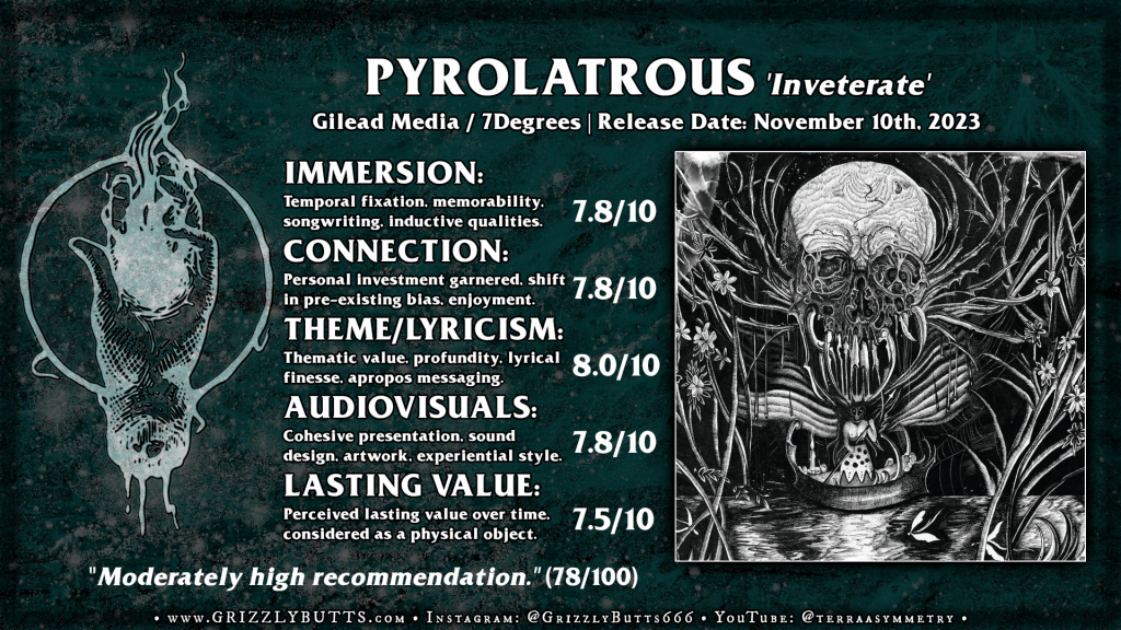Pyrolatrous is a Brooklyn/NYC-based melodic black/death metal quartet today but their debut LP ‘Teneral’ (2017) was primarily the work of Nicholas Palmirotto (Hull) and drummer Lev Weinstein (Krallice, Woe, et al.) and this record notably feels like a quartet performance as its production values feel as if performed in a shared space, realistic yet still immersive in their resound. Though I’d admired the render of this record first and foremost their aggressive, downtrodden black/death metal sound was highlighted by lyrics which appeared personal, of-the-moment and illustrative beyond the usual fantasy drift of the mind. While I’d found a couple of songs had a sort of post-hardcore meets USBM veer to their treatment of deconstructed melody and kind of rocking transitions most of this record hustles past, racing through its rants and creating a dramatism which is not at all romanticist but gritted at the teeth. Brief in its melodic guitar lines but not devoid of sentimentality I’d found the second half of the album, around “The Mire of Dissimulation” and forth, was where the record more-or-less hit its stride and likewise dips into a few of its heavier death metal nods with “Slave of the State” being the piece I’d enjoyed most.