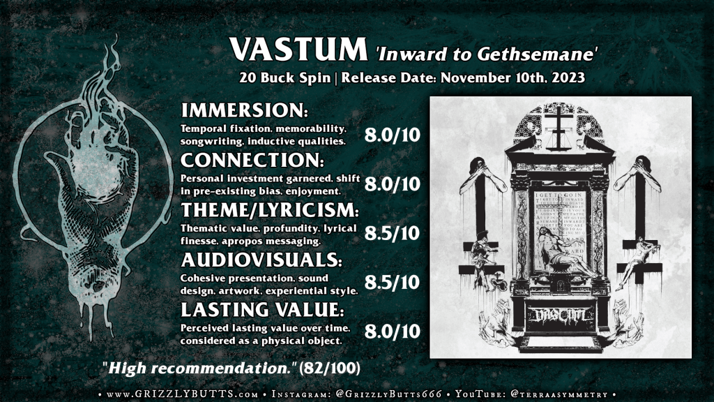 ‘Inward to Gethsemane‘ does a fine job reminding us of Vastum‘s long-standing high standard for death metal which is viably atmospheric, plentiful in terms of notable neck-shaking riffs which are at least ‘old school’ adjacent in their tradition while also providing some manner of evolution within each release. Though their work isn’t progressive the deeper layers of meaning, expression, and arrangement are yet thoughtful and symbolic in a profound way when examined under a closer-in aperture. As I begin to count the virtues of their nauseating craft I’d have to conclude this latest work continues to make the argument that their gear is still very much worthwhile for my own taste. That said, this entry might take a bit longer to bloom in mind and slowly shock with its inward-set extremity and I’m not sure that moment will arrive for everyone as there is an introverted tension which lingers through its presentation that’ll may potentially read as subtle to anyone not already invested. A high recommendation.