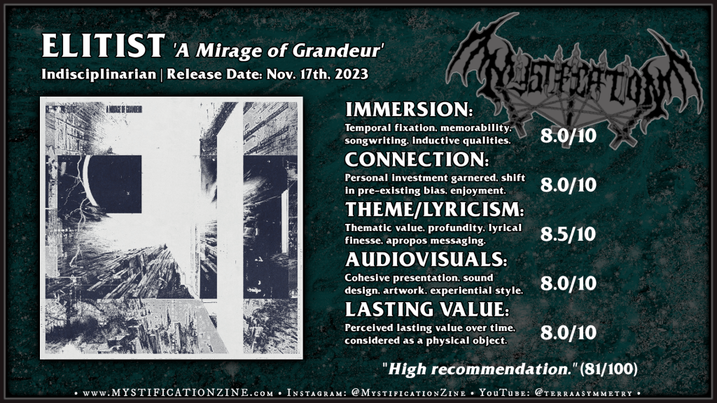 Needless to say ‘A Mirage of Grandeur‘ did have somewhere to go in its first twenty or so minutes and in my mind its destination is ultimately “Sustaining Collapse”, my favorite piece and the most viably atmospheric and death metal driven lunge on this album, a break in the clouds that’d reveal a dying sun, and a satisfyingly low and heaviest point on the full listen. The lingering ‘Unholy Cult‘ feeling spasticity of the full listen kinda amounts to something crucial, illustrative in this moment, or, at least caught my ear and clicked in mind at that point. Add the satisfying endpoint of “Onslaught of Irrelevance” and Elitist have spelled out this notion that all empires must fall, that systems of absolute control eventually erode the sanity of those behind them. The only disappointing bit is the static crush out of the song, not much of a closing point when there was still plenty of room for a bigger moment. Still, cutting off the full listen at just over a half hour ensures this spin doesn’t wear out quick.