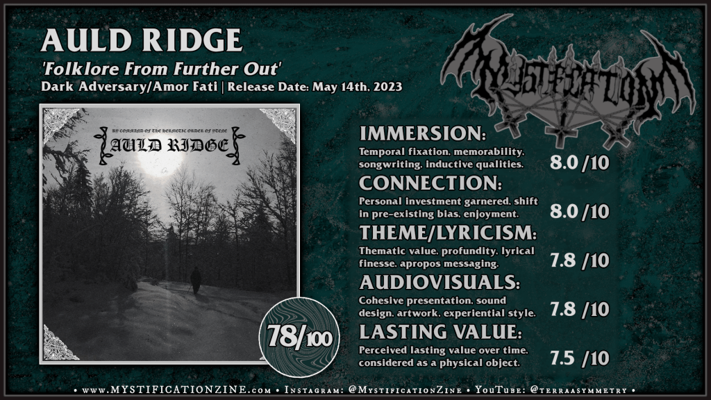 Auld Ridge comes as an newer atmospheric folken side project of British musician O.W.G.A. who is best known for his work in Albionic Hermeticism (who’ve also their own 2023 LP) since 2018 or so. With four albums produced to a very high standard in the last four years most of the material we’ve gotten from this project was composed and recorded in 2021 as far as I’ve gathered and likely pursued either during or in response to the pandemic pause. ‘Folklore From Further Out‘ reads to me as what I’d consider an updated vision of mid-to-late 90’s pagan black metal at face value per its oaken use of acoustic guitars, an inquisitive yet triumphal tread to its oft melodic riffcraft, and especially fine treatment of the rhythm section. As we stretch past the first couple of pieces “The Sound of the Fyrth Begins to Creep” takes us to an differently thawed patch of grass, slightly more vivified and intense than expected while keeping with the general tenets of 90’s revisionism per its less than stealthy use of synths to generate interest in the first few verses. The appeal of this release is broad in terms of its classicist traits, the dynamic will read about as conjunct as that of Ulver-attuned black metal of the late 90’s but the meat of their riffcraft is very lightly rooted in the excitable rise and fall of “medieval” melodic black metal per France/Quebec or nearby. I’d found this album entirely enchanting for its depth of production values, well chosen synth presence, and the guitar driven cut of the longer pieces included.