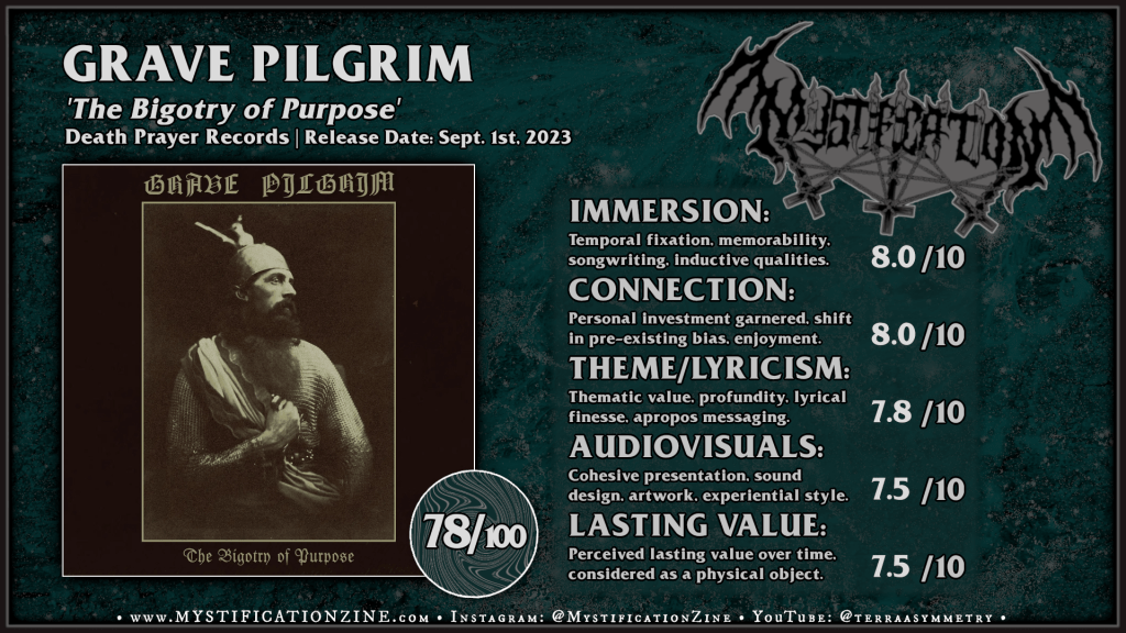 Raw melodic Oregonian black metal duo Grave Pilgrim return for a second LP of what they’ve described as Americana inspired black metal, though I’d just as well figure their clear nods taken from Grand Belial’s Key, Fin, and Peste Noire are more obviate. In fact the riffcraft here is humbly recorded but brimming with heavy metal spiritus and elaborate folken melodicism to the point that the whole of the album captivates from start to finish for my own taste, taking fewer detours compared to their first album and the somewhat under-discussed ‘Molten Hands Reach West‘. Though every piece here has some intrinsic value it was “Sublime Flagellation” which’d resonated most with me and gave the best sense of space inhabited, very much a rehearsal room level recording with its unsteady verve to keep things edging upon the ear.