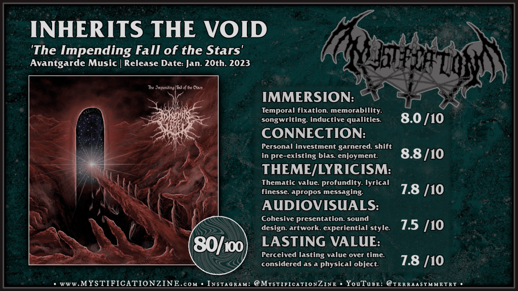 Though I was familiar with the previous LP from this southeast/central France-based melodic black metal project I didn’t recall it being so brazenly Dissection-esque (or, early 90’s melodic black/death metal) in style compared to this inspired second full-length. Rush right to “Sullen Laments of the Wanderers” to see what I mean. Inherits the Void is the work of one Antoine Scholtès and the fellow has completely floored me with this record in terms of a loud, wrathful and riff-forward rush of classic melodic black metal delivered with plenty of bombast and aggressive speed. The holistic effect of this record is cold and biting, not lush or dreamlike so many post-‘With Hearts Toward None‘ formed acts looking to the past for precedence, though there is a bit of an atmospheric black metal glisten to the opener/title track which lends a modern feeling to the first impression. I was surprised this was not marketed directly to me as this is exactly what I am always looking for month after month. A sublime gem of a record with plenty of depth and an effective enough atmospheric drift to its more static moments.