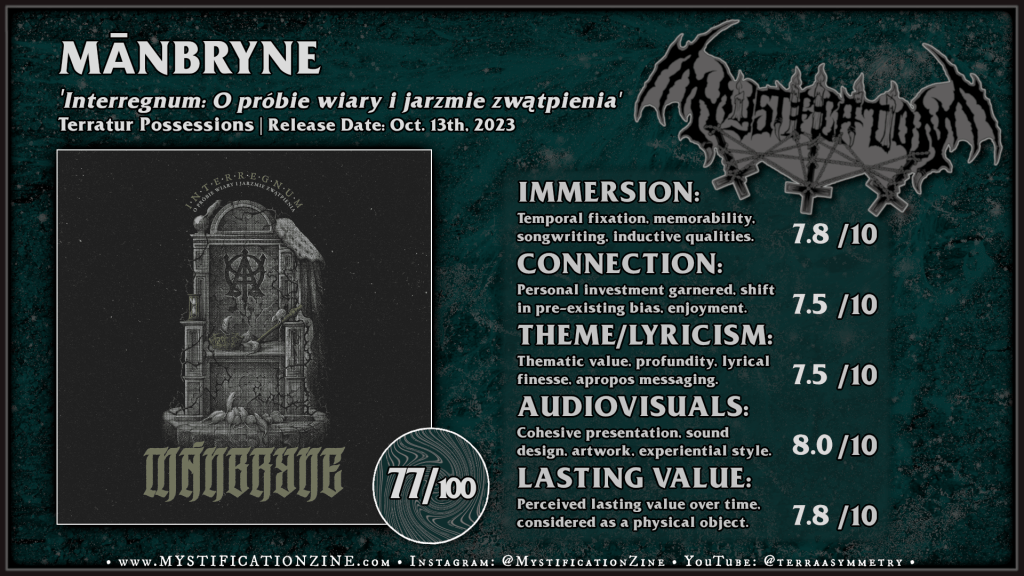 Lublin, Poland-based quartet Mānbryne are not entirely an offshoot of Blaze of Perdition, much of the writing comes from the unassociated guitarist Renz, but it does feel like a lot of the firmament they’d conjured in that other band has instead been implanted into this project as their better known form focuses on something far more accessible. That isn’t to say that their work on ‘Interregnum: O próbie wiary i jarzmie zwątpienia‘ isn’t melodious and easily approached, this isn’t such a fearsome work so much as a surreal experience prone to drone on it is rambling Mgła-esque voicing for ~7-8 minutes at a time, declaring its way flatly through each blasting hymnal. For my own taste the main draw here compared to the first album is the drumming as it’d consistently served the most interest across each full listen. “Grzechy ojców” is the most potent peak of the experience in terms of venomous energy and probably the best place to get an overall impression beyond the droning introductions.