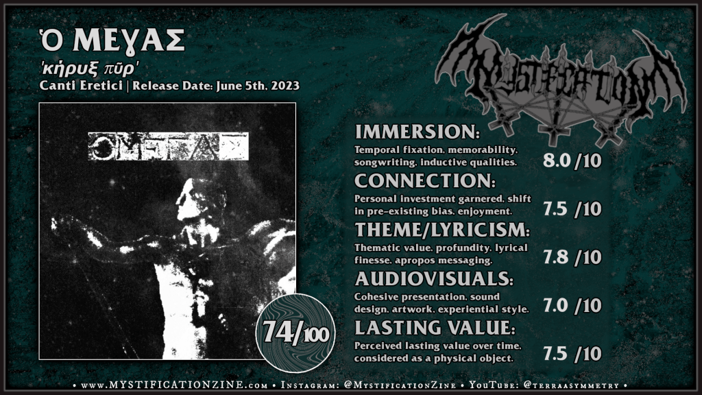 Though some might fear we are beginning to veer too far into the realm of Bandcamp‘s suspect noise and aped-art trash hole this first demo/EP from ὁ Μέɣας offers an interesting enough juxtaposition between very plainly meandering black metal riffs, three-piece drumkit “raw black metal” beats, and various bits of instrumentation which accentuate the Greek theme. I’m not sure that ‘κήρυξ πῦρ’ comes from Hellas, probably not, but the use of various middle eastern and Mediterranean instruments (which are mostly emulated via plug-ins etc.) make for a glitched yet compelling enough work. I’m not sure if I would classify this as sophisticated work or abysmal noise and I enjoyed the uneasy reaction I’d had to it since there is ultimately something musically viable layered beneath the amateurish collision of it all.