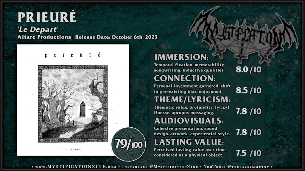 Prieuré is a brilliant black metal project from French musician Sans-Visage and ‘Le départ‘ is the culmination of several years work having developed a unique enough style and tentative resonance spanning several split releases and EPs, first catching my attention per their split with Vermineaux earlier this year. The mood here verges on coldly dismissive to start, almost to the point of a post-punk (no, not gothic rock) which works well with the variously striding and struggling movement of these fairly long pieces. The attitude remains jaded enough but we find piques of passion and sentiment sparkling throughout the involved nature of these melodious works. There is some earnest quality to the tirades included here and this is effective from the strike of the first few songs, taking me along for the ride which I’d found best illustrated in “L’homélie du crapaud” but don’t pass by without sitting through the vital title track/opener.