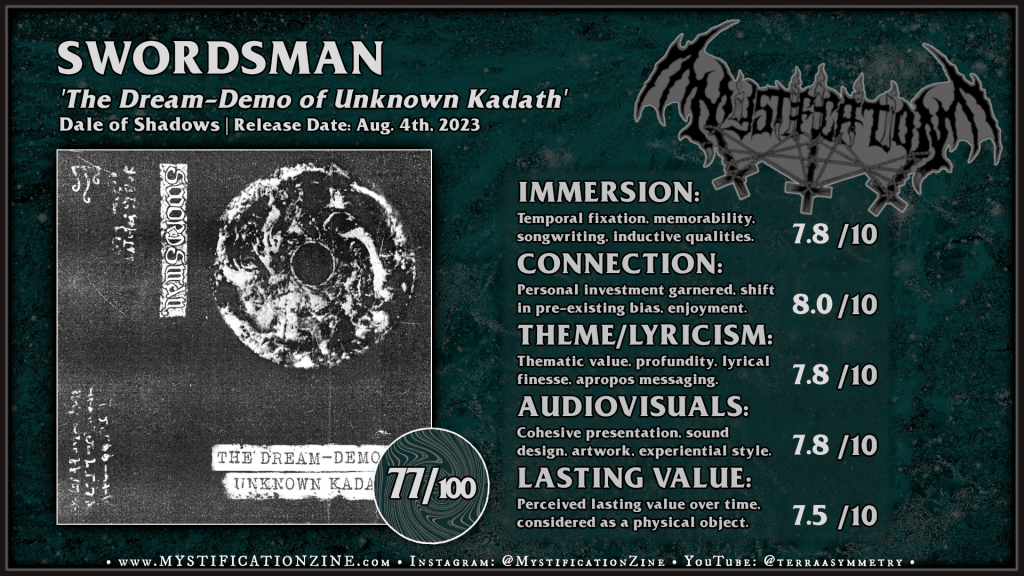 Swordsman is an Ostrava, Czechia-based project from Jan Sludged who describes their sound as raw black metal infused with elements of punk and dungeon synth. ‘The Dream-Demo of Unknown Kadath‘ follows their 2022 Escafismo Records released debut CS as a true demo with rough versions of pieces which appear fully formed and heavy on the tape hiss, warped sounds, and kicking mid-paced aggression. I appreciate their dedication to organic and humble recording sounds as I’d never felt this obscured the impact of the music even in this skeletal state which bears a ton of charm per its old leaky synths and strangely low-set roars. Had to crank this one really loud to get the full effect but I had a great time with. Check out their first LP, too.
