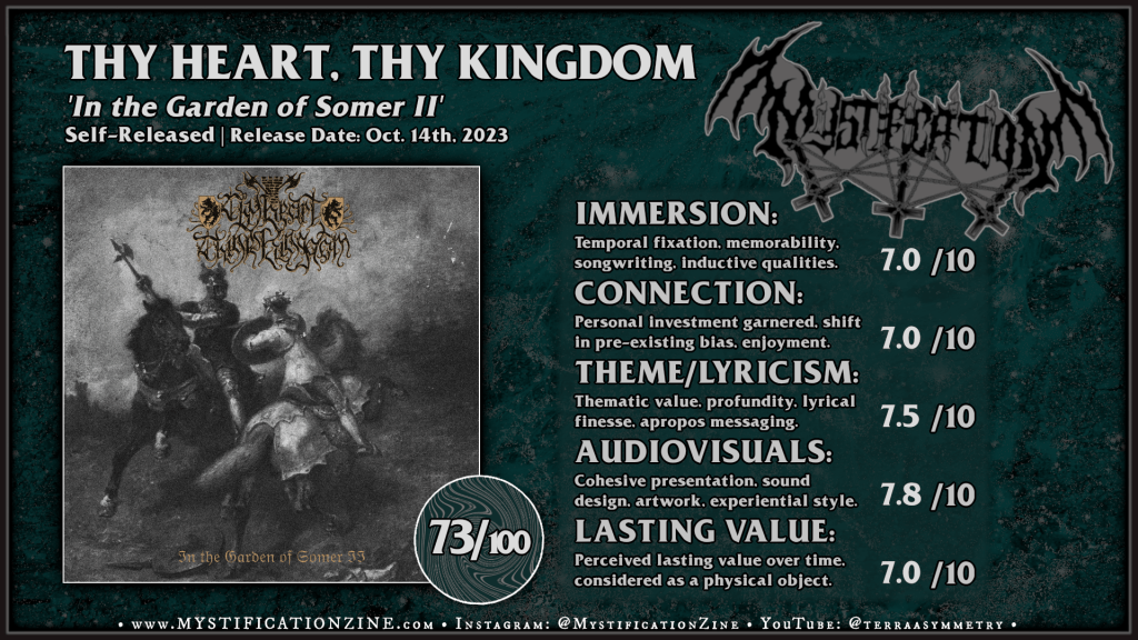 Thy Heart, Thy Kingdom is a side project between members of Till and the vocalist from Calling of Phasmic Presence wherein these folks who’d seemingly discovered black metal through the sopping, unintelligible rawness of pandemic era ‘limited edition’ vampyric bestsellers create derivative raw black metal. If you must have more along the lines of the pre-LP phase of Wampyric Rites and early Lamp of Murmuur, this is similarly buried by digitally applied lo-fi render (“laptop mic rawness“, as I call it) in order to generate atmosphere around relatively bland composition. At some point this type of guitar work feels forced and the vocals kinda confirm this isn’t serious gig but a fun collaboration between artists. The design of the cover art was compelling enough to warrant checking this one out, and I’ve no doubt there are still plenty of folks who’re still finding some value in this well-worn path, but it wasn’t for me.