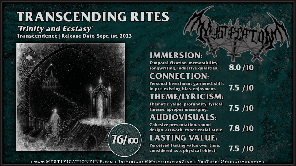 Transcending Rites is an atmospheric black metal duo split between the extremely prolific Déhà and French artist Brouillard, who runs the Transcendence imprint alongside several of her own projects, and this is their third full-length album in three years. ‘Trinity and Ecstasy‘ concerns itself with a primarily linear path which is not uncommon of each musician’s atmospheric ideal wherein a corridor of rumbling sound becomes an ever elusive focal point to fixate on. In this case the two pieces here are singular in thought but not static in movement lending a sensation of constant momentum built, particularly on Side B wherein “Ecstasy” would end up dominating the experience with its rabid pace, hints of choral interjections, and venomous vocals snarling throughout. The overall effect is haunting, simple but effective for the most part. I’d like to have heard much more definition in at least one of the thousand humming guitar layers and I suppose I can’t fault the sub-genre standard rhythm section which functions as little more than a flat and dry plane.