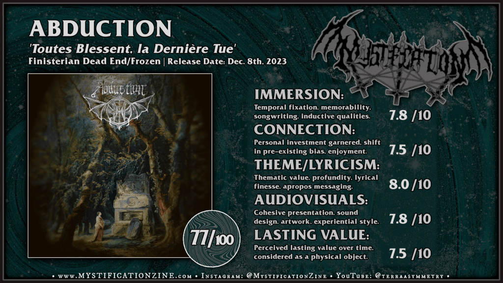 Provins, France-based theatric black metal troupe Abduction first caught my ear back in 2018 per their second LP ‘À l’heure du crépuscule‘, and a couple of records later their style frames itself more squarely around lead-driven melodic black metal pieces and progressive/dark metal with a sombre feeling. This particular album concerns itself with the fate of the untended veteran, the way the used and discarded soldier, but from the ever traumatized post-World War state of the sentimental European mind. The album carries a dour sensibility, complicated by its gang-barked vocals and accentuated by the hum of eloquent clean vocals and a strong but never outwardly flashy lead guitar presence and a persistent drummer keeping the pace double what it very well should be. Though this record reads somewhat chaotic at times it has a strange sophistication within all of the off-color choices made, an act of excess rather than pure refinement.