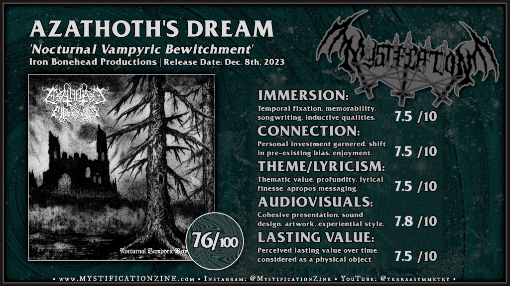 Azathoth’s Dream is an atmospheric black metal project from Lord Azathoth who is thus far best known for his black metal project Luring, for this follow-up to the 2022 ‘Necromanticism‘ tape little has changed beyond the expected focus on songs beyond establishing the dark ambiance a band in this style relies upon. As was the case when I’d checked out the fellow’s other band earlier this year he has a reasonable knack for disjointed, striding rhythmic threads but this doesn’t flip the switch over to truly impressive riffcraft so readily. A very short album with largely ~3-4 minute pieces dominating the tracklist what we get are easily read vignettes and some are more immediately absorbing than others, these will become obvious up front with “A Millennia Perished”, “Phantasm” and “The Grave”. The listening experience is just fine, bit of a duck squawk on the vocals which is a non-issue, and I suppose my only criticism of the album is that ‘Nocturnal Vampyric Bewitchment‘ is just plain, average naive vampyric stuff without a standout personae. That doesn’t mean it isn’t a great listen, though, and there is some strong immersive value to the otherwise short pieces herein.