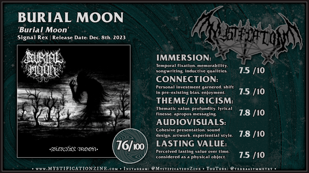 Atmospheric black metal project Burial Moon are described as international and we’re given very little clue as to what they’re all about beyond layout design from the main fellow in Izrod and the fellow from Tomb Veneration doing the mix/master. This self-titled debut mLP doesn’t reveal much in terms of personality up front, a distant and droning sound, bat screams and inhaled horrors might spark up on a couple songs but otherwise this reads as fairly straight forward spooky bedroom black metal to start. There are deeper layers, a sort of raw black metal sense of movement applied to a deeply atmospheric and backgrounded guitar sound and the vocals are, I suppose eerie at the very least between hymnal creeps and such. For my own taste this is a bit too subtle, ghostly black metal without a knack beyond atmosphere which quickly floated out of mind in every case.