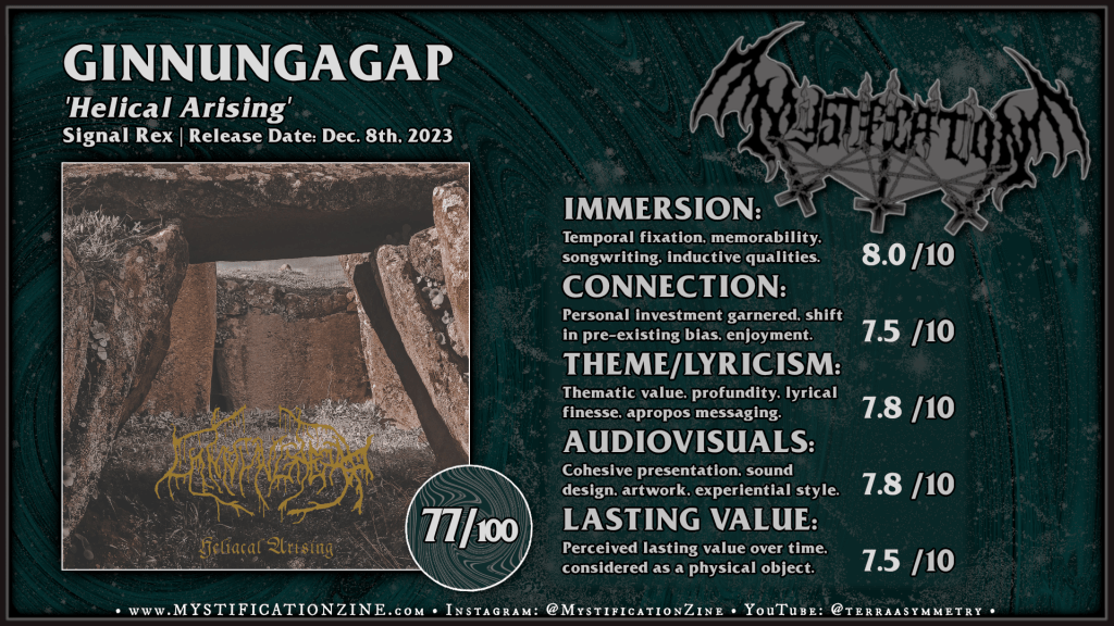 Portuguese black metal project Ginnungagap begin to thaw away the frost of their demo/EP beginnings on this debut full-length, an atmospheric black metal record lead by deep-set parity between the rhythm guitars droning nondescript tone and the hum of their keyboard layers (rendering per Trollhouse Audio) with all of it crashing as majestic waves in the distance with an Inquisition-esque approach to their vocals up front. Most of this album amounts to kicking mid-paced beats, the hum of the rhythms at a horizon level, and seeming endlessly sour rants from the vocalist. Repetitive as this modus quickly becomes as the ecstatic throes of these patterns becomes a self-stirring pot this doesn’t hinder the enjoyment of the spectacle, a warmly arcane approach to atmospheric black metal which barely lifts a finger beyond its whirring motion for the first twenty minutes of this album. “Mysteries of the Primordial Moon” gives us a different variant, something more blasting and rushed in pace without losing the dramatic glow of the experience and from there the rhythms of the album begin to open up slightly. When returning to the ~’97 demo era for black metal this is a sound which resonates more with me than anything attempting to be intentionally throwback and I’d found myself enjoying the surreal drone of this album as it eventually found its variations and nuance while still leaving all interpretations buried.