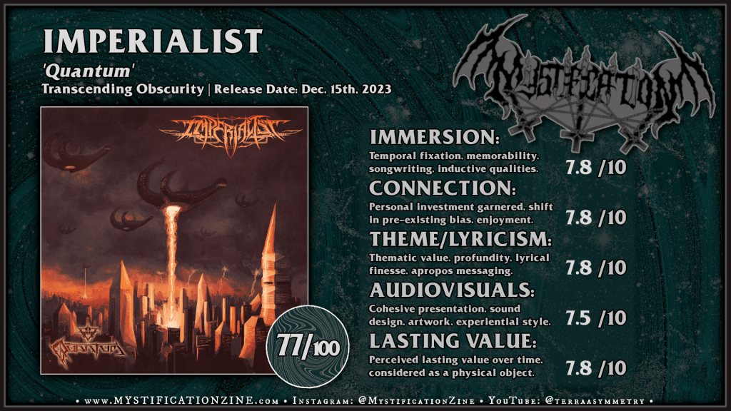 Monrovia, California-based quartet Imperialist are back with new EP and this material isn’t drastically different from their work on album number two ‘Zenith‘ (2021) where they’d left behind some of their Immortal-esque take on thrashing black metal and delivered a forward-struck riff driven approach, steadied but in some ways less eventful than their brilliant 2017 debut, ‘Cipher‘. There is a fine line between refinement and simplification and I think these folks have struck a strong balance between coldly cut thrashing black metal pieces of their own design and some tuneful interest though I have to admit this particular set is surprisingly straight forward in its approach. The one piece here that nails that ‘Damned in Black‘-esque ride of their earlier material, “Call of Vulcain”, and I’d only wished they’d return to those textured and progression-obsessed type of riffs as “Quiescent Terror” picks up a similar thread right afterward. I can’t necessarily argue with Imperialist‘s easily read sound and impactful style, they’ve manage to carry on with this and retain a head-banging sort of quality to their work which is easy to pick up and enjoy in every case.