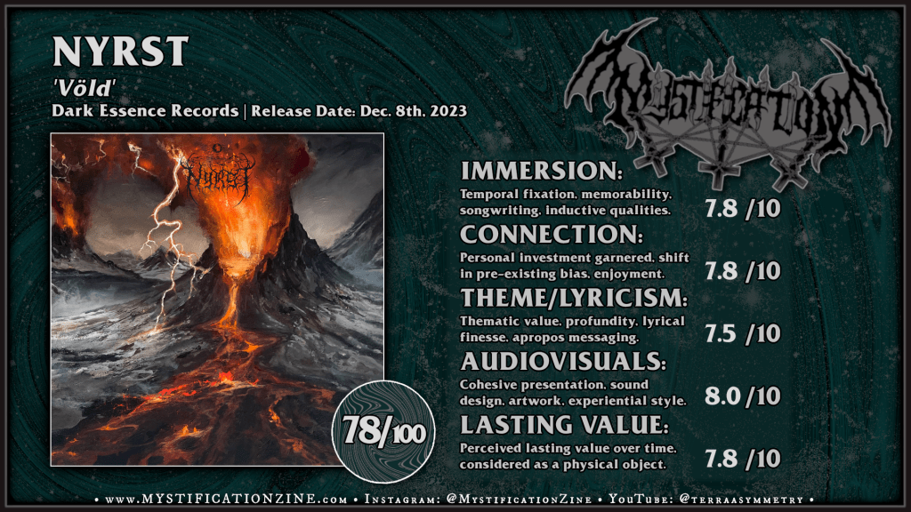 Reykjavík, Iceland-based quintet Nyrst caught my ear a few years ago per their imaginative vocalist and uniquely stated form of modern dramatic black metal and now they return a changed band, refining those vocal tirades while presenting a darker yet still melodic second LP. ‘Völd‘ concerns itself with the forces of nature and of course anyone from their region would naturally associate volcanic activity with this symbolism and, I suppose as cliche as it might sound it does appear they’ve built this album on a more molten, fiery foundation and in turn given a more compelling face to their work. Granted the grandeur available to the full listen arrives with a bit of patience getting there as these folks still have a knack for filling a ~5-6 minute song with its paces though the payoff is usually worthwhile, or, at least always something different than the prior peak. From my point of view we do almost immediately stray from any sort of traditional form of black metal and instead find a menacing form of “dark metal” (see: Aeternus) and a different shade of black metal stride explored herein.