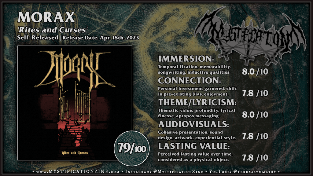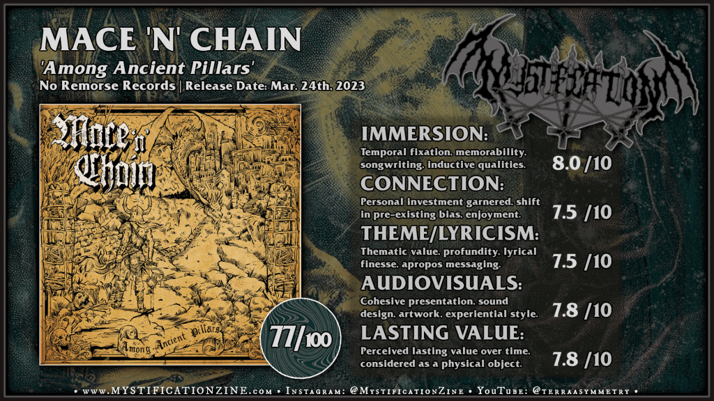 Mace ‘n’ Chain is a pandemic borne epic heavy metal project from Swedish musician David Nilsson, best known for his work in death metal band Feral. When I’d bought his first 2021 demo it was definitely to support the idea even if the vocals weren’t necessarily album ready, with the ‘epic heavy’ Kreator cover being the main reason to see it through. With those expectations in mind I wouldn’t consider ‘Among Ancient Pillars‘ a disappointment but a particularly solid and well-concieved debut LP. The vocals are still pretty flat but they’ve a bit of character somewhere in between Idle Hands-era Unto Others and Grand Magus and Nilsson can mostly carry a tune. The style of this album is likely meant to align with the current bigguns in the U.S. scene (Eternal Champion, Visigoth) judging by the 80’s power edged compositions but only as a first impression these songs are actually surprisingly dense in their moment-to-moment composition and almost begin to struggle to breathe per all the detail available. The production values are sharp enough, though there is a bit of a guitar pro sounding warp to certain riffs on “Defying the Gates” and the bass guitar sound clashes out in a dimension which does little to enhance the rhythm guitar centre of the songcraft otherwise. Songs like “Labyrinthian Black” would sound huge if the recording wasn’t set in such a tight cavern. It all eventually gets there after a rocky start but the induction was well worth my time, a very pro place to start with some room to improve.