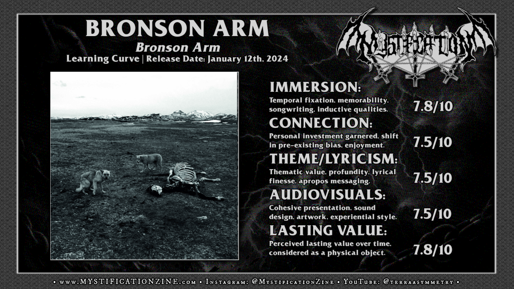 This debut LP from Kalamazoo, Michigan-based noise rock duo Bronson Arm is split between their (‘Tosser‘, 2021) EP which features as Side A alongside five new songs which make up Side B and this creates a very clear divide between the brighter, cleaner layers of their earlier recordings and the far more minimal and noisome dread of their new material. The ‘Tosser‘ EP was meticulous, precise and though the duo split their instrumentation between a guitarist/vocalist and a drummer it’d employed a full array of tempered guitar layers that’d left their gig sounding unique enough but almost alt-rock precocious next to the newer songs that’ve made their way onto this compilation. This has more to do with gnarlier guitar tones, uglier noises (is there a TV on in the background?) and gloomier stretches of ringing chords which introduce themselves on “One With the Floor” and less to do with their songcraft beyond allowing more space for the dread to ring through uninterrupted. The simpler and more distraught their pieces got the more I connected with them and I’d quickly began to prefer the more obnoxious and dismal side of the band, even when stretching into a psych-garage rock tangent on “Rabbit Starvation” and the art-rocking mess of “The Devil You Know”.