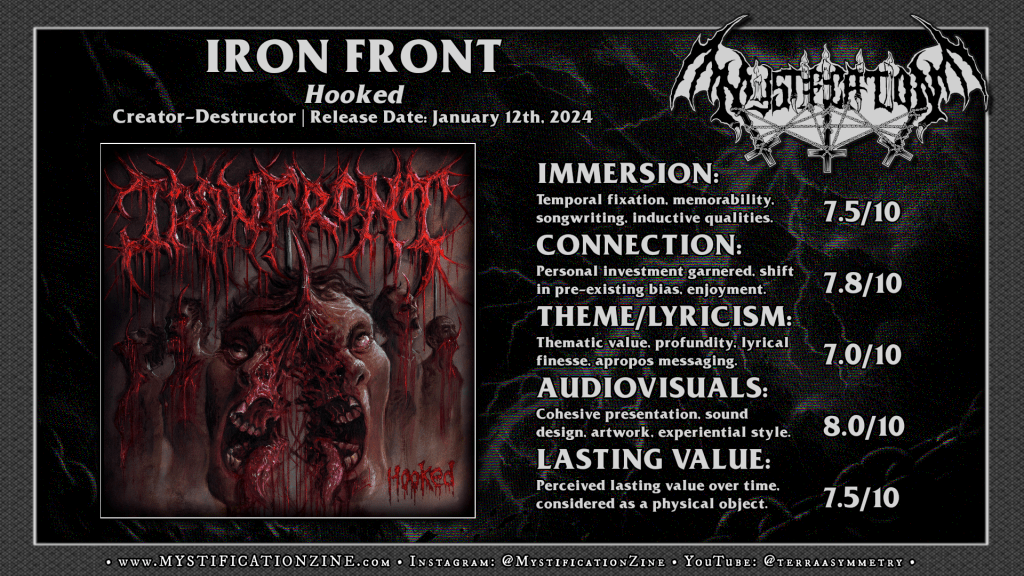 With a hundred dry admixtures of beatdown and classic brutal death spin-kicking down the chute with short-ass releases these last several years it isn’t hard to keep up so much as it is hard to differentiate one green-assed face value take from another. In the case of Oakland, California-based quintet Iron Front two things stand out from the first listen, the main vocalist suits the cavernous dry-rotted production values perfectly and they’ve kinda got chops enough to convince on the beatdown side of things. In terms of riffs they’ve always got the walk of it down pat, one foot after another, and the whole deal is short enough that repetition doesn’t erode the rush of it all but they definitely jump back into a predictable pocket of simpler breakdowns as the album grinds on through. When I put on my death metal hat, meh. When I think back to being in my late teens listening to metallic hardcore and brutal death in the late 90’s, sure, I get it. “The Slam of ’87” is the one piece that goes the extra mile to grab the ear but the absolute tank-slapping bounce of “Pig Splitter” was great to return to on repeat listens. Not sure if it’ll grow on me but if they hook into meaner death metal riffs here and there in the future I’d give a bigger thumbs up.