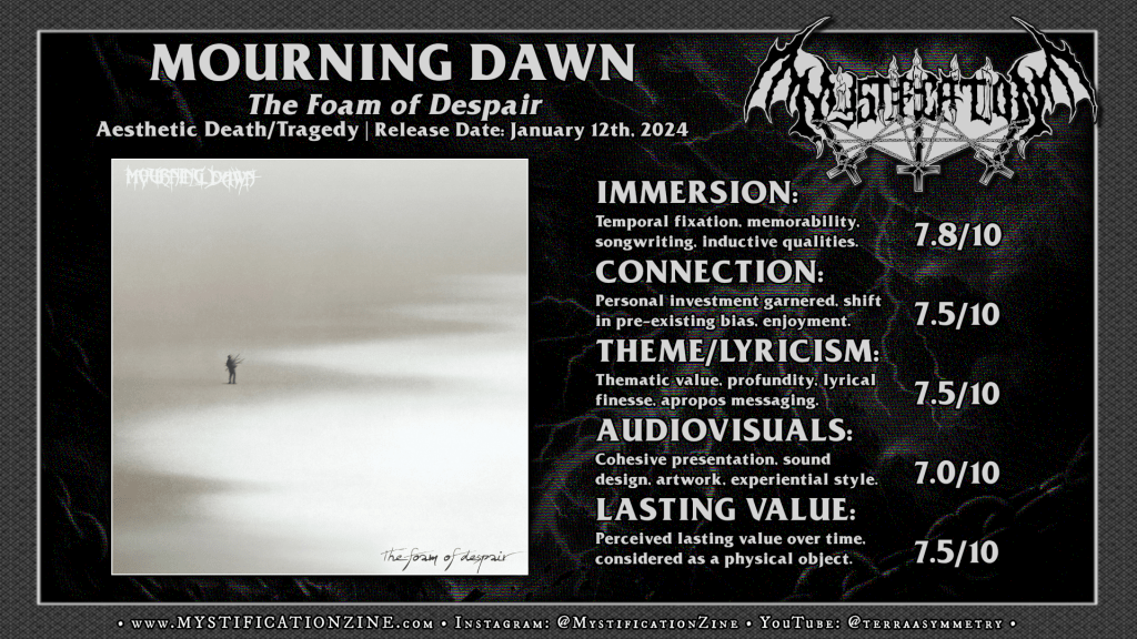 Now achieving their sixth full-length release just beyond their twentieth year since formation Parisian black/doom metal quartet Mourning Dawn craft yet another depressive plunge into their unique enough realm of blackened dark metal and melodic death/doom metal inspired aggression. They’ve long been best at creating pockets of disturbed dark metallic bliss, dramatic melodic pieces set within the tumult of depressive black metal vocals and heavy atmospheric doom metal grooves. While they do well to showcase their best traits on “Blue Pain” and the eerie ruptured build of “Apex” their heavy use of spoken word, garbled voice recordings in French, and frequent interruptions per these voices quickly becomes a point of irritation on two of the longer pieces (“Tombe du Temps”, “Borrowed Skin”) which introduce the album and this is before the trap beats and industrial groan of the curious “Suzerain” (also closer “Midnight Sun”) arrives to do something entirely different. Though I wasn’t sure what to think at first I’d ultimately appreciated getting something unheard of, unexpected and non-generic from these folks rather than just another album even if not all of it is to my taste.