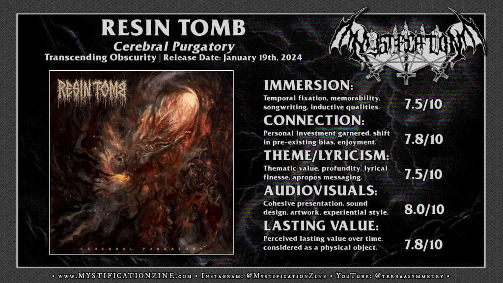 Brisbane, Australia-based quintet Resin Tomb set their collective dials to the rusted gears of grinding, dissonant death metal but they’ve walloped the whole machine with elements of sludge on top of their sound to keep it filled with clangorous murk and neck bristling severity which serves the moment well as they conjure an imposing whirr. Fans of more recent stuff from Wake and Vermin Womb will quickly pick up on the all-out energy of ‘Cerebral Purgatory‘ but there is (eventually) more of a brooding edge to some of their work (“Human Confetti”) which suggests they’ve got more than wilding, slammed through menace in their gig. Their vocalist just kinda goes to eleven and stays there for a wall-to-wall shouter but there is enough breathing room to enjoy the oddly-angled riffs and brutal but brief impact of the full listen. I wouldn’t say it burst my skull into chunks but I appreciated the high standard set across the board for a debut and solid choices for both gritty and col production values and appropriately dark album art.