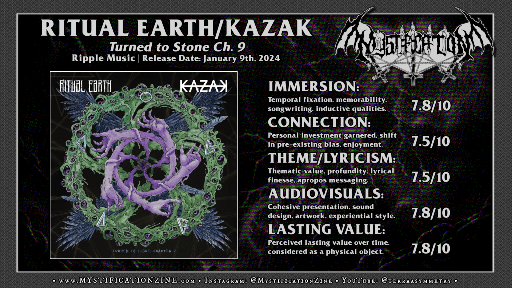 The ninth volume in Ripple Music‘s ongoing ‘Turned to Stone‘ series of split 12″ LPs features Philadelphia-based quartet Ritual Earth and Italian duo Kazak as a fairly well-matched pair of psychedelic doom-rock groups who bring an easy, painless groove to their work. Ritual Earth are on the blues rock side of the fence with a bit of earlier Shannon Hoon in their vocalist’s cadence thanks to the use of effects which (mostly) work amidst the syrupy prog-tinged and keyboard riddled heavy psych they generate otherwise. They’ve done a fine job of leading with a soulful register but this becomes stretched, twisted out of shape the longer they roll with it and to the point that “Ominous Aurorae” kinda misses its landing. Kazak are similar in pace but different in most every other way as an Om and Ufomammut inspired duo concerning themselves with mantra driven psychedelic doom metal, of course this is much more my speed and by the time they’ve broken into “Haze” the hypnosis had fully set in. I’d appreciated the pairing here as each half brings their own calm to the table for the sake of atmosphere built upon keyboards/synth and ringing guitars though I didn’t walk away from this one stunned by the songwriting on either side.