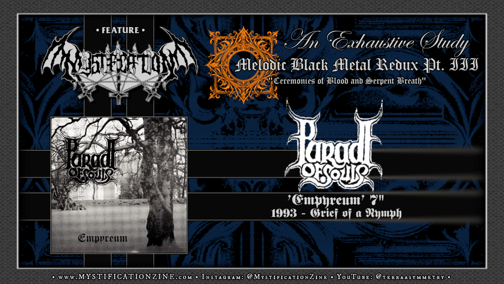 As we walk away from the first half of 1993 CE there is the sense that we are none the wiser in terms of full-on melodic black metal but the brimming melodic black/death metal formulas are bristling with inspiration as we head into August knowing full well that the second half of the year would yield some incredible works which would move us both closer to (and much further away) from our discussion on the shared traits of melodic death metal, melodic black metal, and their natural fusion. Expect a primer on the most sophisticate works from Dark Tranquillity and At the Gates in Part IV to be the peak of our mention of melodic death metal-leaning records beyond a few supplemental releases here and there in the late 90’s. Otherwise we’ll hear a bit more from Norway, Poland, Greece and even Ohio of all places as we cover the second half of 1993 next time.