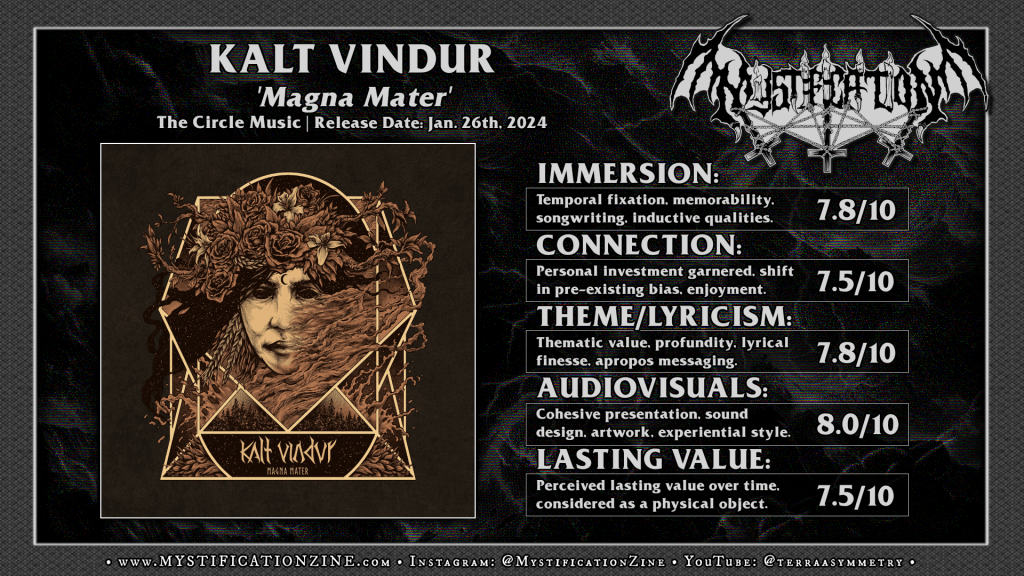 For their third full-length album Polish quintet Kalt Vindur introduce a new drummer and a new translation of their intention to bring their “Podkarpacki Black Metal” sound into clearer resolution. Described as progressive early on per their first album and additionally given the “black/doom” tag for sullen atmospheric values on parts of the second I think a more broad application of the pagan black metal tag creates a more meaningful umbrella for their still-evolving ideal but I’m not sure their approach is as traditionalist in reach as that’d suggest. Acoustic guitars and irregularly stroked rhythms shatter any sense of outwardly tuneful experience yet nothing so vividly avant-garde rises from the foam they’ve created. The result is an album which takes a queasy, unsteady path from its driving opener/title track (“Magna Mater”) through some narrative pieces before the second half of this total ~35 minute ride grasps in all directions for ideas. I’d enjoyed the arabesque rhythms of “Agonizing Luminosity” and the anxious dread of “Bless Us” as the center point for the full listen but I’d found myself struggling for a knack, a hook, or any reason to return to the album for deeper listens. The fine art curation and sharp modern production values return to the high standard set by their second album yet this time around I’d fallen off of their work unusually fast.