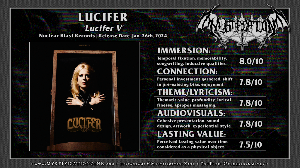 Stretching into their tenth year with a fifth full-length (and their first for Nuclear Blast) in hand Stockholm, Sweden-based heavy rock group Lucifer return with a strong, soulful follow-up to the darker edged themes and points of fusion ‘Lucifer IV‘ (2021) had sported. At this point they’ve broadened their reach within the 70’s inspired neo-occult rock headspace beyond heavy blues standards to include hymnal heavy metal pieces like “Fallen Angel” and “A Coffin Has No Silver Lining” which step well into the 80’s but the bulk of this album leans into the easier going heavy rock bustle of ‘Lucifer II‘ and ‘Lucifer III’. Light shades of Maiden, Blue Öyster Cult, and whatnot lead the way in but anyone familiar with Nicke Andersson‘s ear for verbose melodies and switch-footed rhythmic turns will appreciate songs like “Maculate Heart” and the ghostly “At the Mortuary” as the album burns on. I’m still partial to the first two records but I’d found this one easy to pick up and enjoy.