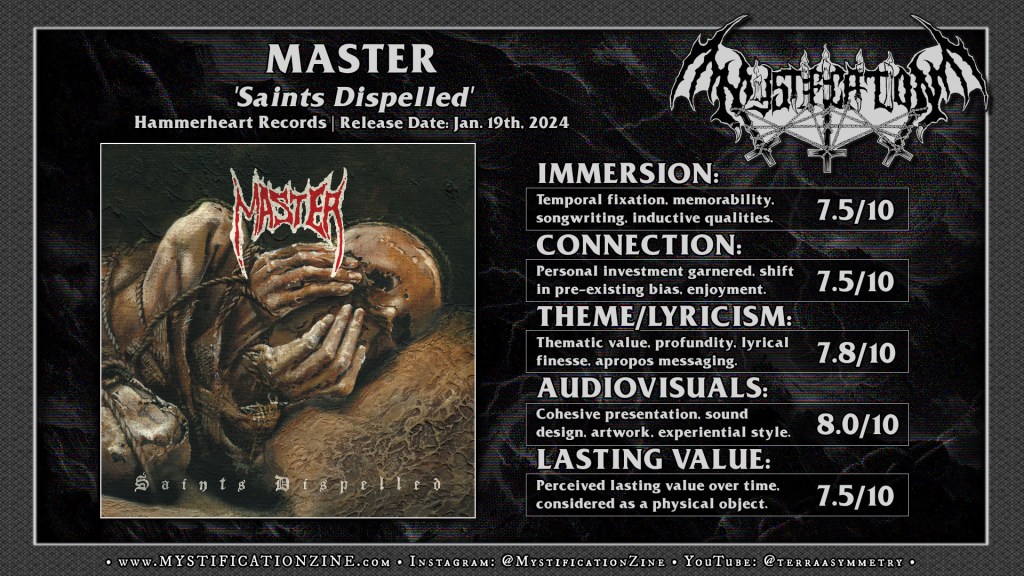 The fifteenth full-length album from Master might’ve given me a chance to write about some of Paul Speckmann‘s best work per my own taste (Death Strike, Abomination) and such but I’d found I couldn’t muster all that much enthusiasm for this record. Though I’d liked a few of their releases beyond 1993 during the Pulverised and F.D.A. years I’ve found the only major changes made to the template year over year are updates to the subject of the lyrics and I’ve always had trouble following Speckmann‘s diction. Otherwise this one has some interesting punk inspiration to certain songs, some familiar song structures (“Minds Under Pressure”, “Marred and Diseased”) but lacks all-out riffs from my point of view. “The Wiseman” is a pretty damned interesting song to start but the tendency to lean on a wah pedal kinda kills the striding heavy metal ride of it all in the middle.