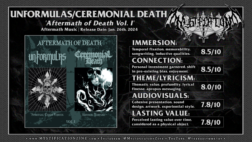 ‘Aftermath of Death Vol. 1‘ is a split 12″ between two newer morbid entities from well-known Swedish dark-artists, first featuring the better known UNFORMULAS which is a newer project from Nicklas Rudolfsson (Runemagick, The Funeral Orchestra, et al.) and vocalist David Nilsson (Feral, Mace ‘n’ Chains) who’ve concocted an alchemic blurring of classic death metal trod, surrealistic doomed movement, and a curiously meandering “epic” float to certain pieces. This ends up landing as both recognizable as the artists work but also something which intends to step outside the box, toy with dissonance and upscaling movements while still making wrathful and heavy death metal. If you prefer to jump into the deep end you could maybe start with their album ‘Post Mortem Visionary‘ (2022) otherwise I’d felt like these three songs (essentially the ‘Spiritual Chaos Vortex‘ from November 2023) do well to introduce the darkest yet plumb into the depths of their sound, especially standout “Devouring Torn Souls” and its lumbering step.