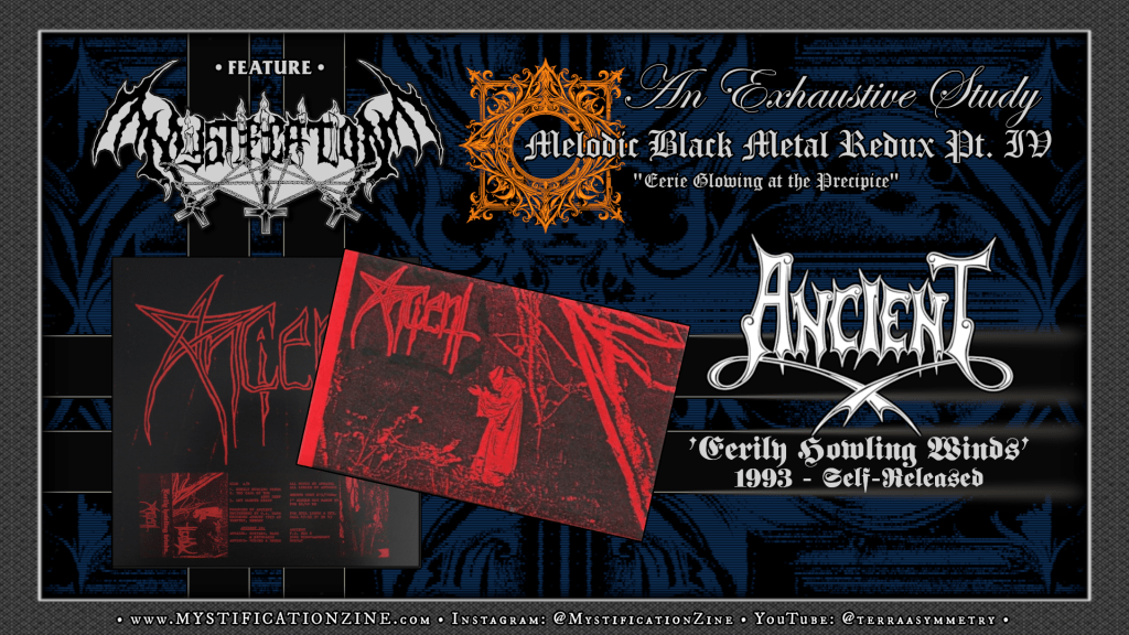 Ancient weren’t the first band out of Bergen, Norway to make the switch from a demo-level early 90’s death metal project only to quickly pivot into their own far more original form of black metal though they were perhaps the first which has been noted as consistently relevant to the melodic black metal tag since making the transition. After Aphzael and Grimm put Putrefaction behind themselves circa 1992 they’d spent most of the next eight months putting together the material for this first demo tape. ‘Eerily Howling Winds‘ would eventually release in August of 1993 and to some considerable infamy selling a reported 700 copies and eventually getting them signed to French label Listenable Records with it. Though the tape was self-produced it’s sound quality was clear enough and substantial in its statement that it would eventually be properly archived and reissued, even getting a vinyl version in recent years (2022.) Though the archival reissue contains over an hour of music the actual demo consists of three songs, runs ~17.5 minutes and is melodic in the sense that these folks are exploring melody in the context of traditional heavy metal, a Norse equivalent to Agatus in some sense, though their work would become far more sophisticated on their next couple of releases. This band will be an important fixture through roughly 2004 or so. Credit due to Soulseller Records for leaving the sound of the demo intact in their reissues rather than remastering them.