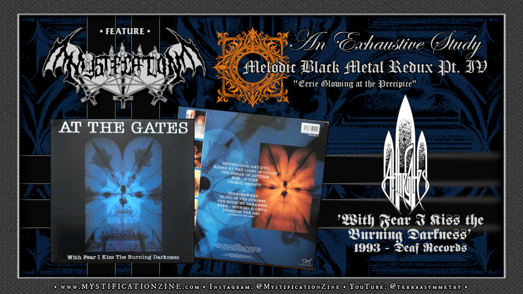 Released in September of 1993 but in motion since the 1991 recording of their first album ‘With Fear I Kiss the Burning Darkness‘ was a monstrosity but not necessarily a black metal band, rediscovering and taking a closer look at its contents serves a great reminder that At the Gates were always a bit different from their peers, frankly far more original and daring at this point. The thing to remember is that the high level the Gothenburg scene had elevated toward together included black metal and black/death metal bands. Otherwise, I am forever in awe of some of the pieces on this record and have given up hope on any manner of plausible recreation of the feeling it creates.