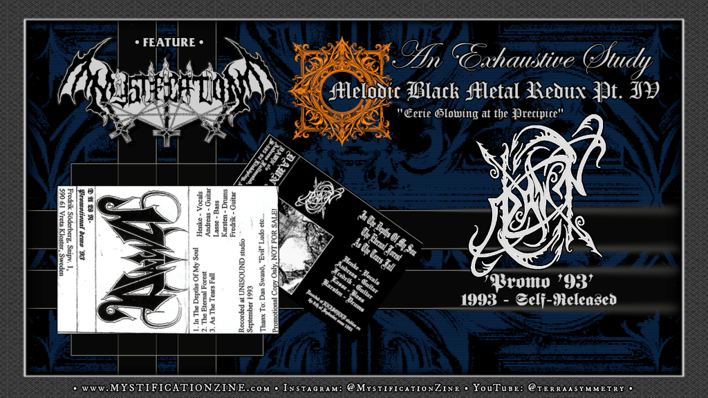 The second half of anno 1993 CE finishes our exploration of melodic death metals wider reveal and steps into the realm of melodic black/death metal with the Swedish black metal scenery in mind. Again these are important albums for the sake of influential aesthetics, musicianship, style of composition, and their adjacency to the smaller black metal scenes forming across Sweden at the time. Remember these are observations and separations collectors, sophists and marketing efforts would assign in hindsight and our goal is provenance as we generally gather what melodic black metal looked like as it exited the cave of death metal or early first wave black metal, whatever the case and how that’d evolved quickly. Don’t worry, we will focus on more melodic black/death metal beyond this point but the 1993 entries are the only ones which directly explore melodic death metal for the sake of context.