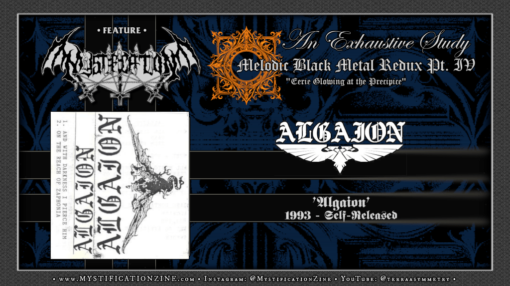 Algaion were an Åtvidaberg, Sweden formed black metal band founded by guitarist/bassist Mathias Kamijo and vocalist Mårten Björkman after exiting their death metal band Abemal in 1993. By the end of 1993 (October) they’d had two songs ready to put to tape and did so on Halloween night (the vocals followed a few days later) and the result was somewhat of an eternal outlier in the Swedish black metal scene as this tape had much more in common with the early Hellenic black metal sound per the choppiness of its drum machine-attended guitar work and the simplicity of its arrangements as a result. I’ve never been clear on whether or not they’d been directly inspired by bands like Rotting Christ but their work will certainly appeal to folks who enjoy that sound. That said the melodies which drive “On the Reach of Zaphonia” are far more sophisticated than that might suggest. We will talk about this band’s work a number of times over the course of study so, this is a fittingly quick dip into their realm as a raw and uninterrupted demonstration.