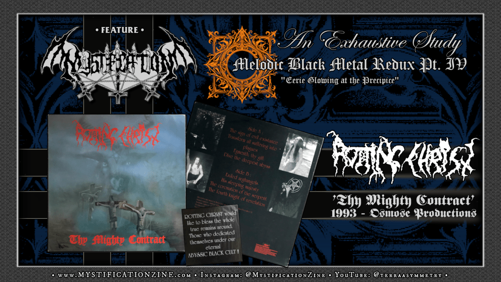 For whatever reason this debut full-length from Rotting Christ always fit and faceted itself squarely into mind from the first listen, soon becoming permanent fixture as a basal point of reference and taste when it comes to my enduring interest in black metal. A bit of thrash, classic black metal, and traditional heavy metal movement translated to simple electronic drum kit clatter means this feral but wise-beyond-its-years black metal album not only manages brutality but a distinct melodic voice which’d advanced far beyond the percussive slugging of ‘Passage to Arcturo‘ at this point. When dissected down to its moving parts, influences mentioned in their extensive memoirs, and the obvious mystic quality of these works the enduring popularity of ‘Thy Mighty Contract‘ makes more sense, a tuneful realm thick with atmosphere captured modestly and somewhat against the odds of being noticed. The main melodic device comes by way of guitar arrangements from vocalist/guitarist Sakis Tolis who would elaborate upon these ideas and develop his own style over the course of their first three or four albums. Released on November 11th in 1993 this is what I’d consider the first verifiably melodic black metal record which wasn’t directly infused with death metal.