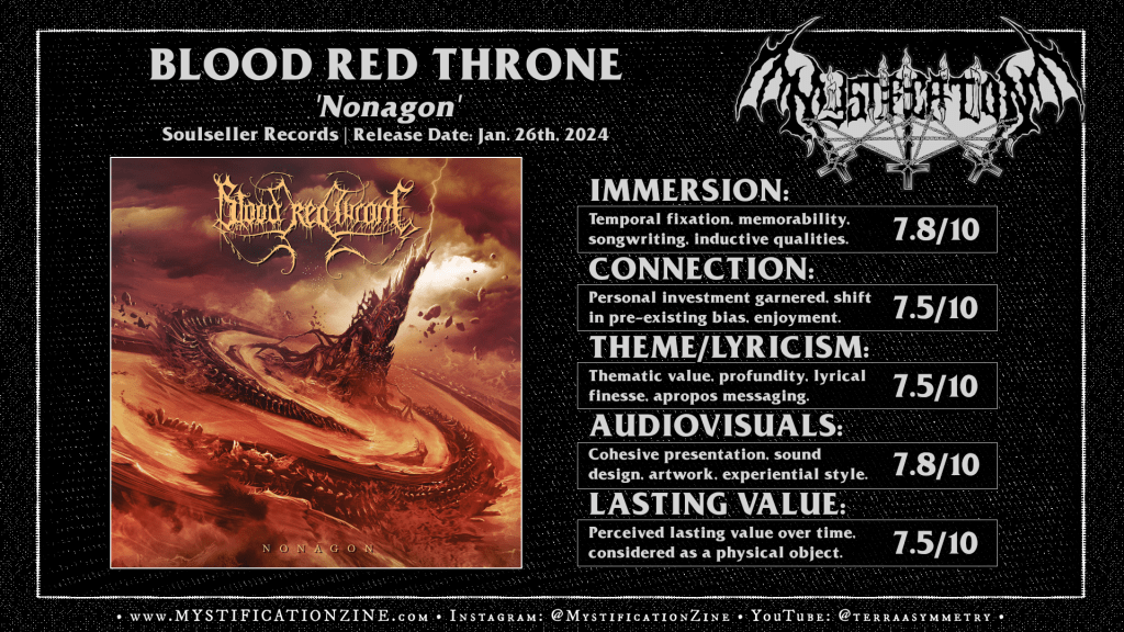 The broad appeal of a band like Blood Red Throne is no fluke as they’d made a name for themselves by way of persistence on the road and via simple songcraft, focusing on the brutally achieved texture and the functional relationship between instruments inherent to mid-to-late 90’s death metal to create kinetic groove metal inspired riffs as their driving force. They’d never been outright technical per their original surroundings in the late 90’s/early 2000’s, it depends on the album and the line-up after that point, but the driving force of the group has typically been something like “meat and potatoes” death metal of the moment. The sing-along aspect of Deicide hits here and there, a simplification of mid-90’s Cannibal Corpse riff wheel and some of the melodic side of later Dismember loosely flavors their craft. Their production values were decided upon in the mid-2000’s and this is what kinda holds back ‘Nonagon‘ from my perspective (beyond not liking every aspect of the vocalist’s range) which feels like a step back to the dry, clattering era where bands like Nile and Behemoth were treated with a less than dynamic render for the sake of harsh brutality. I don’t have any truly strong opinions beyond that, though I do think this is one of the best album art choices to date.