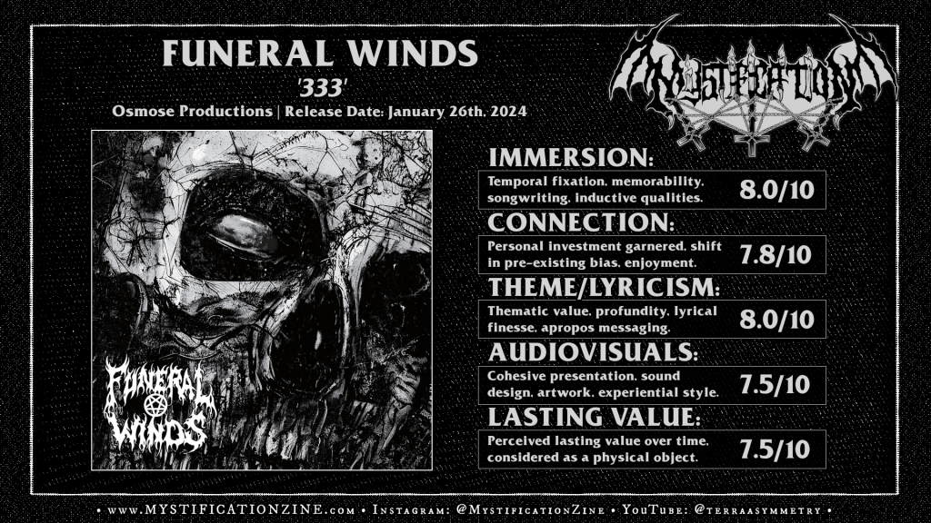‘333‘ is the eighth full-length album from Netherlands-borne and Czechia based artist Hellchrist Xul‘s traditional black metal entity Funeral Winds. Around since the early 90’s but faced with a nearly ten year gap in their 2000’s era output this fellow has been incredibly dogged in his pursuit of the riff since 2017 or so with each release bearing the standards of early 90’s black metal from a very straight forward point of view. Bestial Summoning, Mayhem, and Demoncy all come to mind as the raw garage-burnt guitar sound and backgrounded drum hits hurl along these ~4-5 minute songs. Though the rhythm section may as well be background noise (by design) and the vocals are a less than tuneful hiss, the main point of interest here centers around fantastic guitar work delivered primitive but menacing in most cases. The first half of the record jets through its best riffs within the first handful of songs but I’d stuck around for a few additional listens for the sake of slower burners like “Forever Cursed and Bound”, finding the mid-paced side of the band best suited for these production values (or lack thereof.)