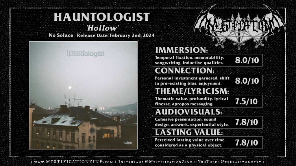 Hauntologist is a long in-process experimental atmospheric black metal project from The Fall (Over the Voids…, Owl Woods Graves) and drummer Darkside, both longtime contributors to Mgła among other projects. Their process seems to be a matter of crafting around a skeleton of what comes naturally to the duo, an atmospheric and driven form of modern black metal which derails itself for the sake of post-metal segue, occasional neofolk pieces and post-rock infused tirades. More importantly the desired effect is not a welcoming lush cascade of comfort but rather an anxietous gallop through dangerous lands wherein a dark and listless clench of the jaw seems to dominate the atmosphere created. The sense that time is passing, death encroaching, and the fruits of all labors are rotting away is well met. The mid-album feature of “Hollow” as a neofolk piece is brilliant but somewhat out of place at the heart of the experience, if only because there are no other pieces which compound these traits on the running order. “Car Kruków” seemed to be the song to confirm it at first but doesn’t end up delivering more than a blurry fade out of the full listen. If they’d brought three or so neofolk inspired pieces into the fray I think ‘Hollow‘ might’ve stuck in mind longer but as is I think they’ve proven these ideas work together well enough.