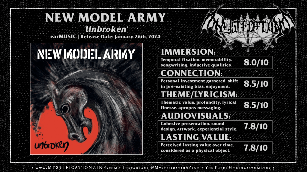 The sixteenth full-length album from Bradford-borne rock band New Model Army reminds us once again of the core flexion of the band as folk anthemic storytellers, still bearing the signature affect of Justin Sullivan up front after forty-plus years but also letting the basslines do a bit of the work per their best known 80’s songcraft. If you’ve not found yourself following the spiritual journey the band’ve taken beyond 1990’s ‘Impurity‘ much of this album may feel out of left field, having balanced some of their social and political commentary with more personal work (see also: Sullivan‘s solo work) as well as a slow process in approach of theatric modern rock ideas. This is yet a bigger vision, or, expansion of ideas which were nascent in the distant past. As a longtime but not at all consistent fan I’d say ‘Unbroken‘ stands out in mind primarily for its uptempo pieces, the folken new romantic/post-punk jog and shake they’d been noticed for early on is yet part of their core experience but the dramatic and orchestrated side of their work is also at least partially in view on a couple of songs here after the recent success of ‘Sinfonia‘. Per my own experience the album’d had its say around the time “Legend” hits in the second half and from there the directional feel of their presentation gets a bit lost in these atmospheric rock pieces. That said, if you’re more partial to their worldly, warming folkish style and dramatic reach that may very well be when the album picks up. The alt-rock swinging of “Coming or Going”, the signature tragedian anthem “I Did Nothing Wrong” and bassline footed movement of “Language” were the major highlights for my own taste but all in all we get a bit more than we asked for (and most all of it well above average) from this long running act.