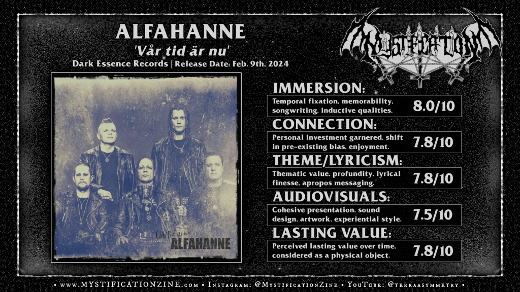 After nearly fifteen years of taking left hand turns to get a better view of the scenic rot, the piling detritus resultant of the parasitic human condition, mounds to the point where one ultimately finds themselves either spiraling inward with fatalistic haste or completing the circle around the heap. In the midst of dancing around the havoc with increasingly dark yet predictably angled turns Eskilstuna, Sweden-borne “alphapocalyptic rock” quintet Alfahanne now take a full nose dive into the pale, accelerating toward the end on this darkest and heaviest yet full-length album. This fifth record from the band , ‘Vår tid är nu‘, embraces what the previous four hadn’t in that it pours its black metallic dread on enough that it reads one step beyond beyond black n’ roll aesthetics. Their core paradigm is not entirely disturbed herein but a few smaller tonal changes do well to unlock a series of far more compelling lures, a different sensation and a better fitting skin.