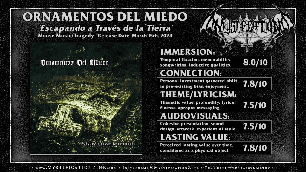 This latest full-length album from prolific Spanish stargazing melodic/atmospheric death-doom metal project Ornamentos Del Miedo takes a turn back toward prominent celestial synth and dreaming slow movements, something closer to the pacing of bands seeking the cusp of funeral doom through walking paced and extended pieces. I’ve been a fan of this fellowes work for a few years now and while I find the sentimental signature and gorgeously soaked atmosphere just as affected this time around this 2022 recorded venture focuses quite deeply upon one core idea per song and it’d left me slightly impatient when wrapped up in the moment-by-moment of it all. While I appreciate the iteration achieved between each release I think the visuals and the cluttered production values are both perfectly stylized for their niche but could be just as well elevated with a few simple changes. That said, there are some new ideas explored here such as the unexpected grooves found on “Donde la Linea Termina” and the more familiar tuneful swagger of “Fragmento de Espejos” was appreciated. A vital discovery if you’re forever in search of generational decline in the vein of earliest Katatonia.