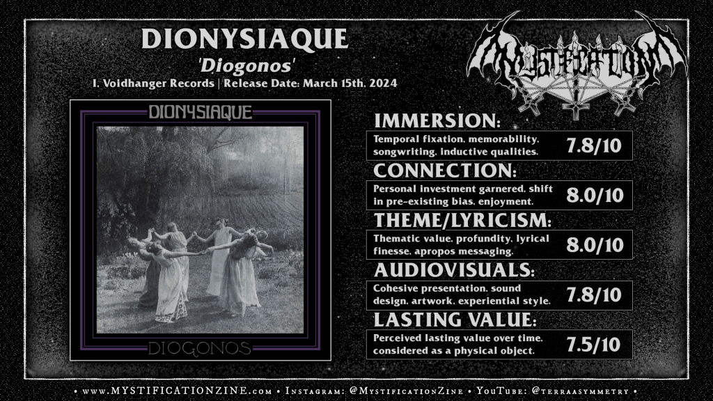 Their mystery cult now fully alive and prepared with a unique form of ancient unorthodox doom metal in-skull Strasbourg, France-based quintet Dionysiaque arrive upon a sound and style I’d describe as ekstasis afflicted, entranced by a uniquely stated ritual which might involve one or two traditional doom metal inspired riffs and declarative and theatrically stated vocals (see: Reverend Bizarre) amidst a sort of progressive level of musicianship applied to an otherwise raw and organic form of doom. Though this is admittedly a rough one to describe on paper it shouldn’t be all that alienating an experience for fans of post-millennial traditional doom metal, though the vocal performances may prove over the top for some. While the guitars are the energetic directive of their action the real boon enjoyed within this avant-doom showing comes from the spring-loaded and wood rich bass guitar tone of their work, never stepping on the toes of the guitarist(s) and drummer both of whom provide some inspiration for the darker side of the bands work on this EP. For my own taste the most interesting parts of this album are the deeper sought and extended pieces wherein each song has a slightly different touch from the jammed reaches of “Evohe” to the lengthy mid-album epic “Vineyard and Ivy”. The impressive command of the rhythm section goes a long way here.