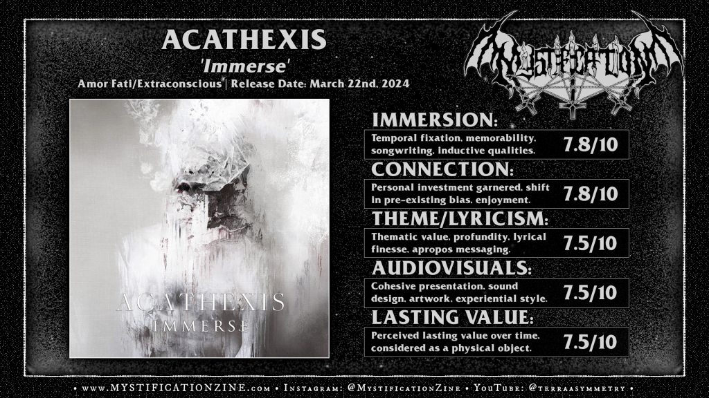 Acathexis is an atmospheric black metal trio from the main fellowes behind Mare Cognitum, Los Males del Mundo, and Déhà wherein they’ve returned beyond their 2018 debut LP for another set of four longform pieces which replicate the sound, fury and feeling of that debut. In fact they’ve made a point to suggest that nothing has drastically changed in their approach to this run-on style of atmospheric black metal which streams thick and cacophonic, cold and rushing along with some intermittent bursts of subtle melodic interest. In direct comparison with their first album I’d found the lead guitar work shows some clear improvement here and this quickly leads to some charming pockets of interest on the first and fourth songs. The album has an effective enough droning effect and, as its title suggests, one of the strongest qualities of their work is its immersive value. Though I’d not found the full listen a lasting fixation I did appreciate the different stylistic underpinning threaded through each piece which’d helped to differentiate each.