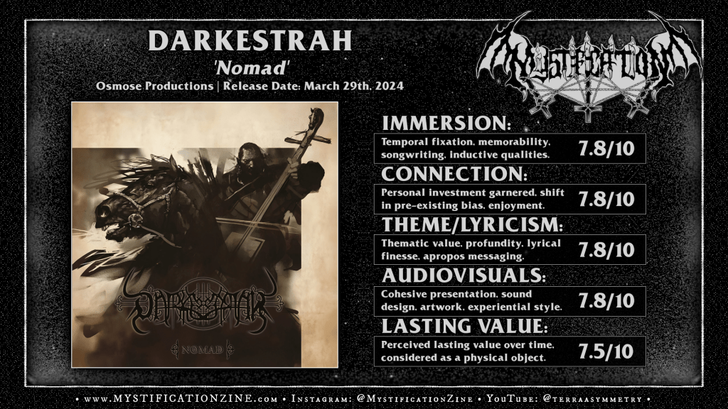 Bishkek, Kyrgyzstan-borne and Germany based pagan black metal quintet Darkestrah return for a sixth full-length album and thier third consecutive for Osmose after a nearly eight year break beyond the last. Folken per their use of indigenous instrumentation and ‘epic’ in scope thanks to carefully developed song structures and extended lengths, ‘Nomad‘ makes a strong case for the band’s signature style and sound up front. From my point of view the album begins to impress somewhere nearby “Destroyer of Obstacles” for its atmospheric orchestration and the equally outsized but far more aggressive step of “Question For the Soul” afterwards. The folk metal side of the band is surprisingly the place where their work impresses most nowadays thanks to a distant, dread-filled yet easier going pieces (see: “Kök-Oy”). Although I’d not ultimately found a particularly profound connection with this album despite several repeated listens that didn’t stop it from being a memorable spin and a fine return to their unique sound.