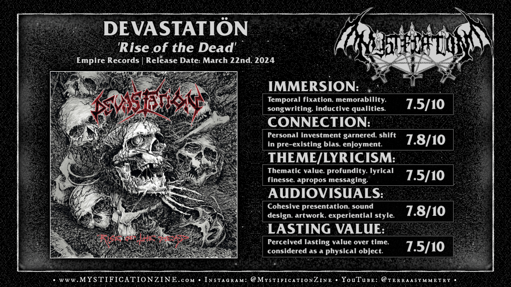 Though black/thrash metal band DEVASTATIÖN didn’t give me any reason to expect much on this third album and follow up to, eh… ‘Pussy Juice Blues‘ (2015) but after checking out their back catalogue the first impression of ‘Rise of the Dead‘ wasn’t terrible. Somewhat generic composition, some faster-cut riffcraft and an ill-advised drum sound (per what sounds like programmed beats) leaves it all sounding like a bedroom project from the early 2000’s. Though the album wasn’t impressive to start by the time I’d hit the “Eternal War (For Immortality)” around the mid-point of the full listen things picked up a bit in terms of their witching metal inspired thrash but it’d been a shame that the organic feeling of the record was never fully realized. Again the drums are what kept me from getting too involved with this record though I will say the guitar work does begin to shine as the album shreds on, lending a feral thrashing aggression to this otherwise repetitive and kinda clunky extreme thrash record. Otherwise I’d appreciated the cover art and this somewhat changed, possible more serious vision for the band’s sound but I couldn’t ultimately sign off on it after five or so spins.