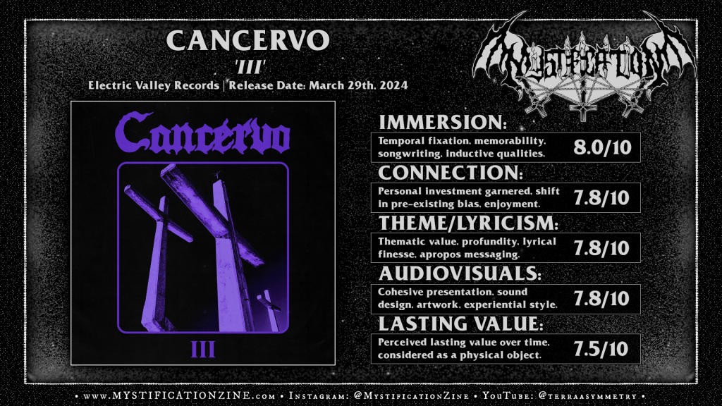 No doubt folks seeking the darker, most possessed side of stoner and psychedelic doom metal forms will find ‘III’ first but I’d likewise suggest that Cancervo‘s work carries at least a small bit of the possessed and horrified oak of Italian doom metal in their work this time around, too. Their works here read along the lines of spiritual doom metal, a type of shamanic or searching rhythm applied to a scene-setting or storytelling aspect available to their previous album now begins to cement as a core trait of their interest and I’ve found myself transfixed by this development, especially considering what a difference just a year or two has made between each release from the band thus far. Though it may not be the most dynamic, emotional or riff-crammed experience available to doom so far this year the level of fixative interest and general immersion available to this album is well worth the time of folks seeking something a bit different within their stoner/doom adjacent interest. A moderately high recommendation.