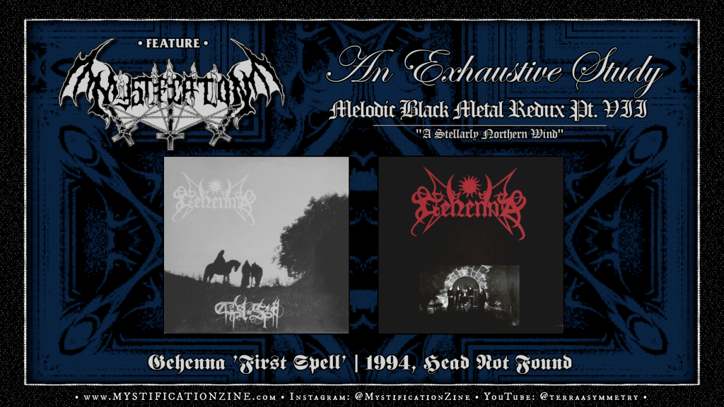 The debut EP from Stavanger, Norway-borne group Gehenna was recorded at Soundsuite Studio from the 3rd ’til the 7th of July 1994. Apart from a nearby rehearsal tape this would be their first release to feature now accomplished and well-known drummer Dirge Rep. My appreciation for ‘First Spell‘ runs deep thanks to its haunted yet entirely tuneful organ grinding and traditional yet folken heavy metal riffs (see: “Unearthly Loose Palace”) which’d aligned with my favor of Ancient‘s work as well as predisposing me to be an adoring fan of everything from Falkenbach‘s debut LP to the early works of Black Magick SS, setting a certain standard for tunefulness and complex melodicism of its own type. Back in the day, and for me it was the early 2000’s when I discovered this album, it still felt like a lost gem and an obscure release that folks had shoved aside and not appreciated for its unique character in the past.